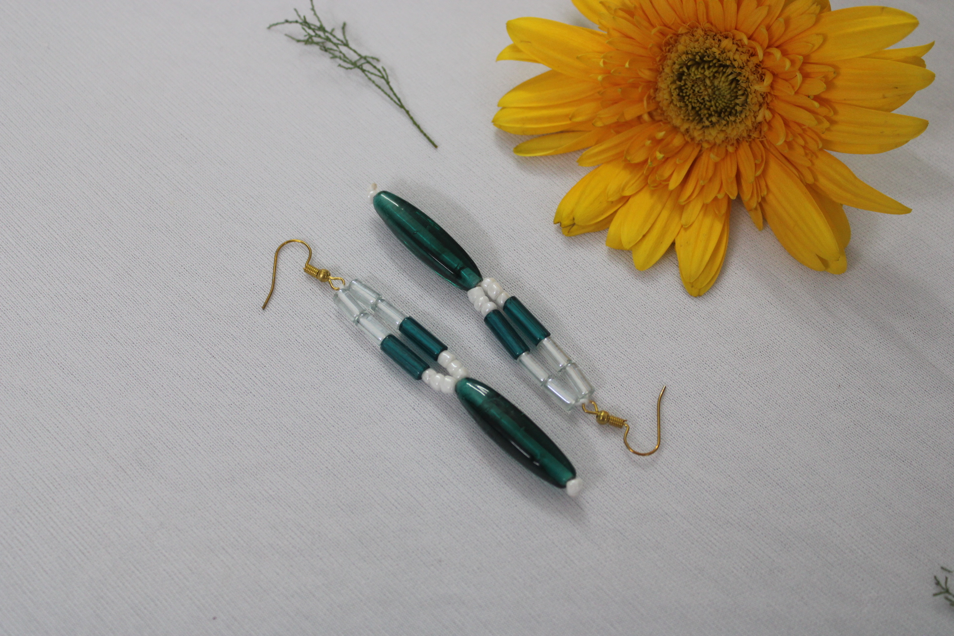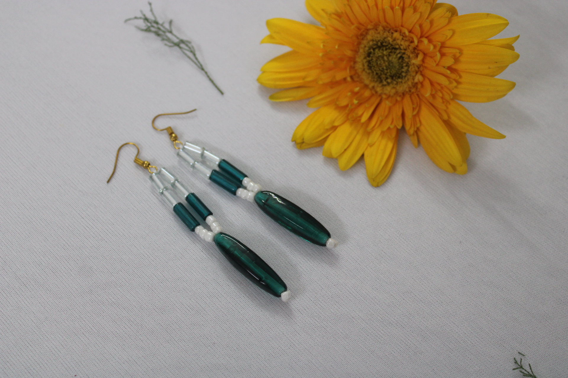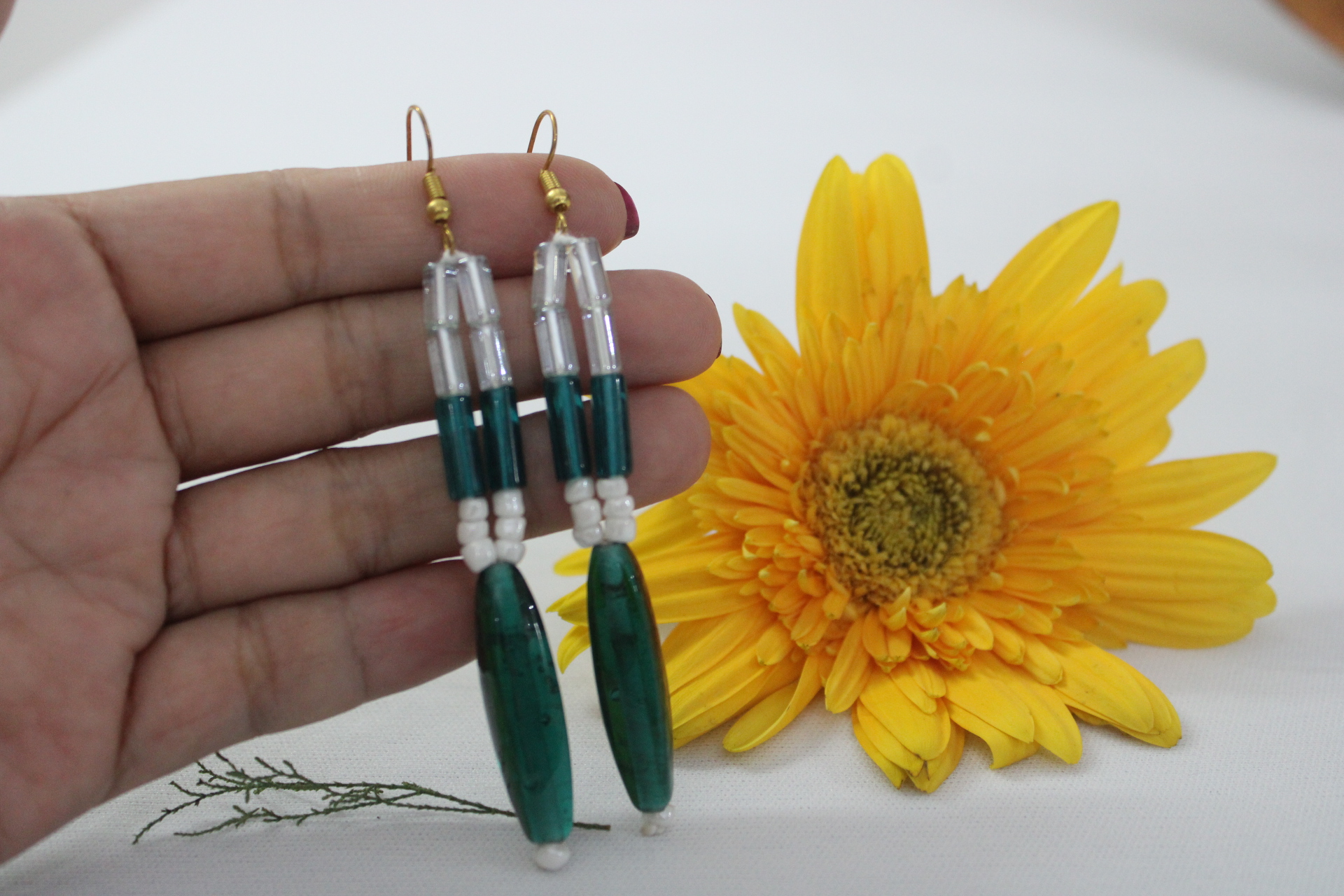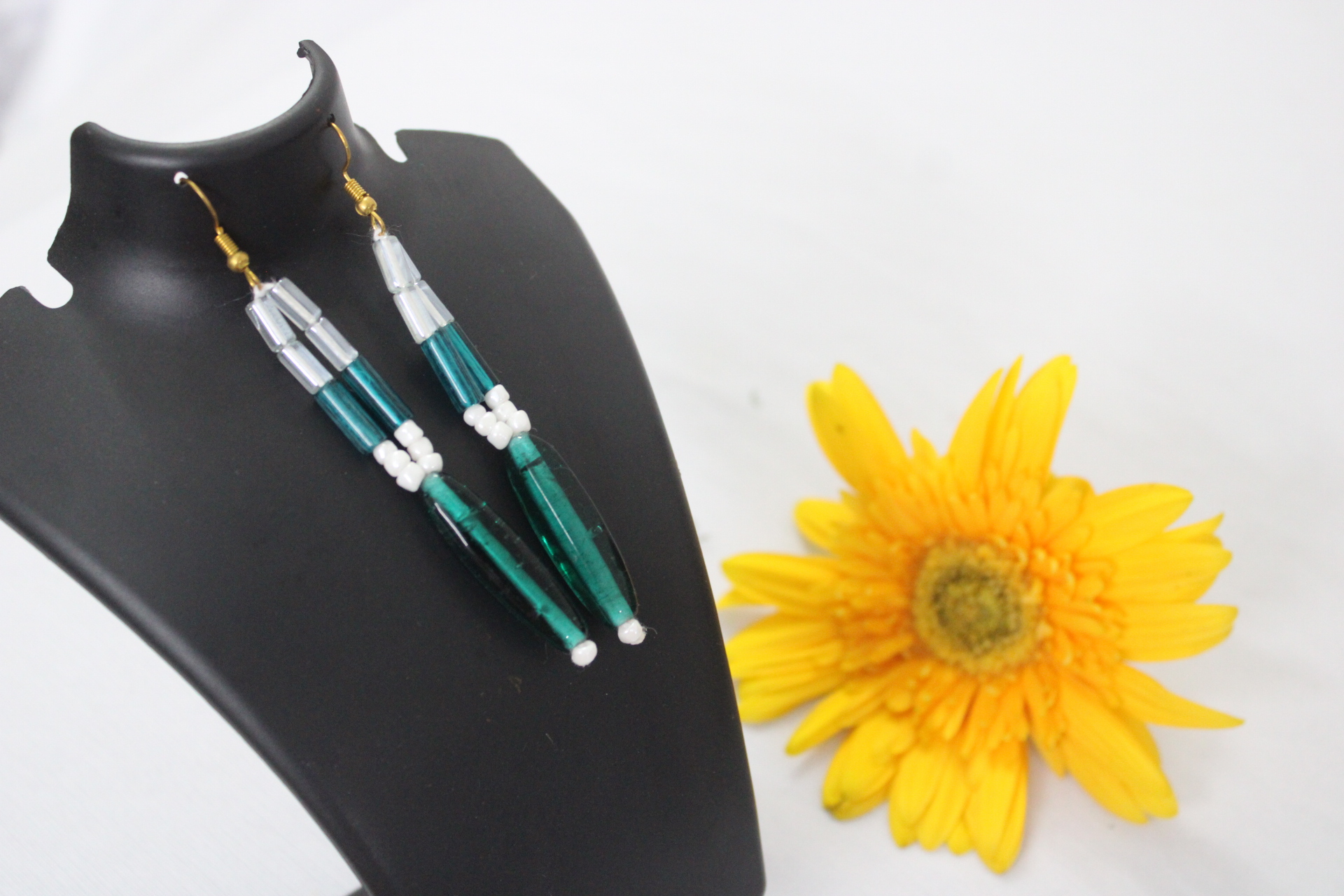 Beautiful traditional earring, big blue long chamthei | two strings with blue and white pipes & beads