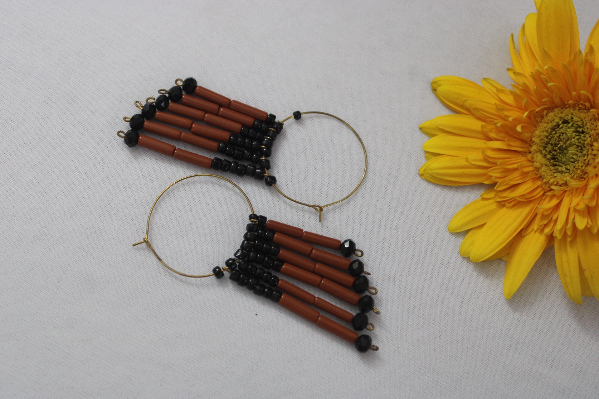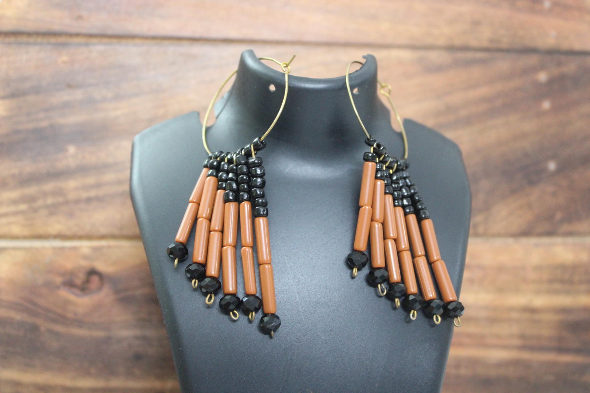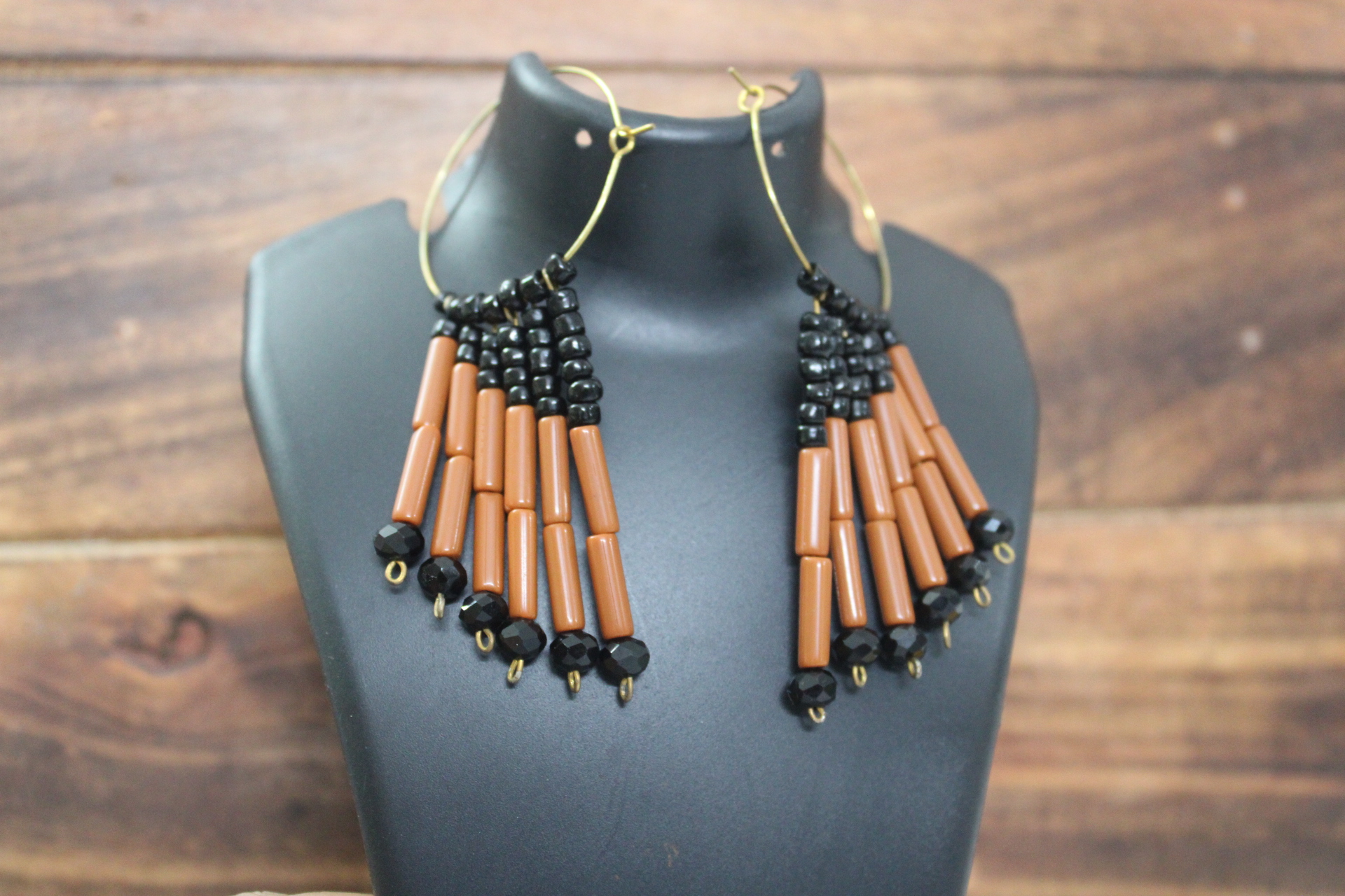 Fancy round earring with 6 strings in stepped design, brown pipe | small black beads