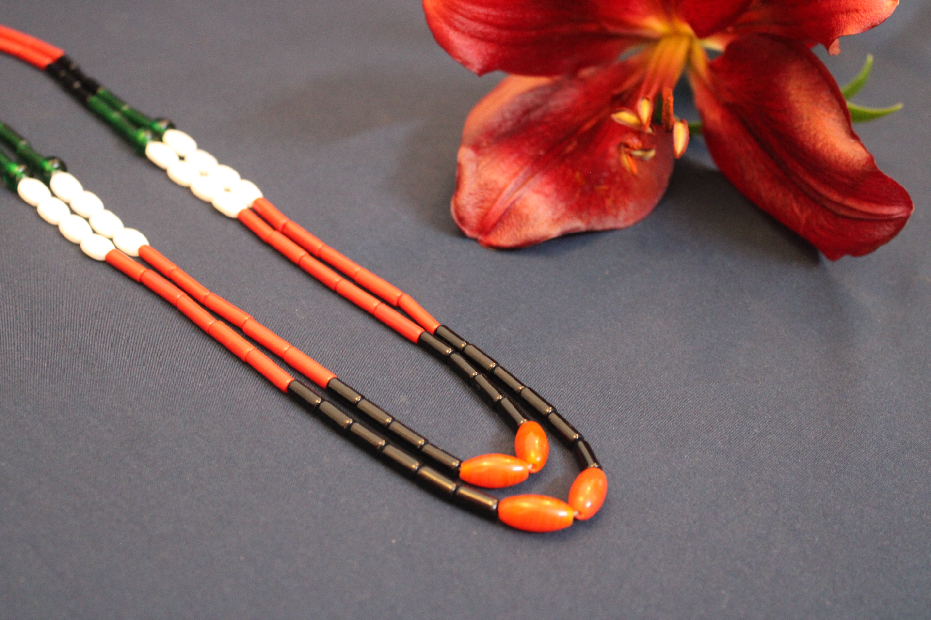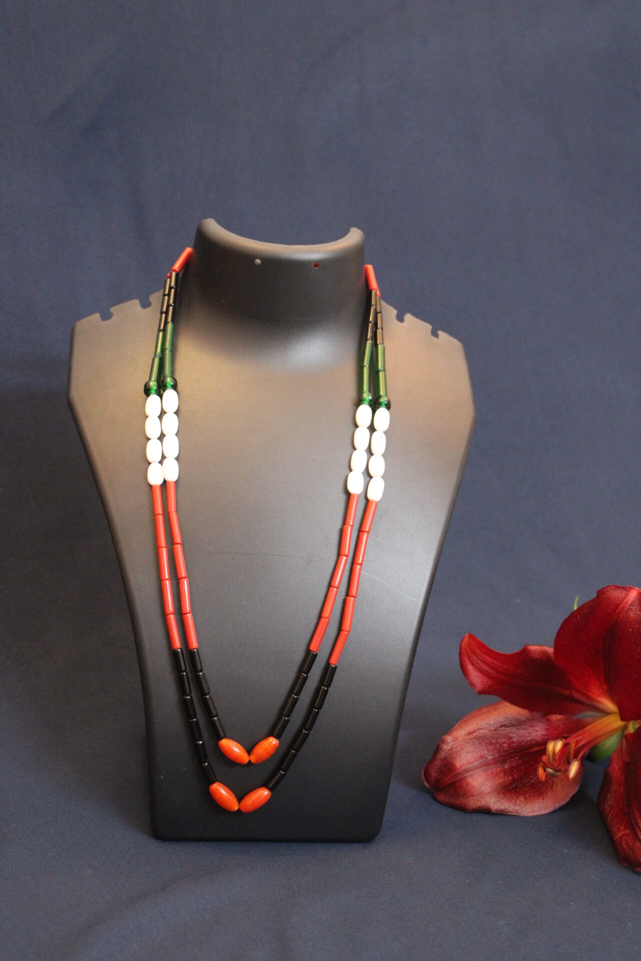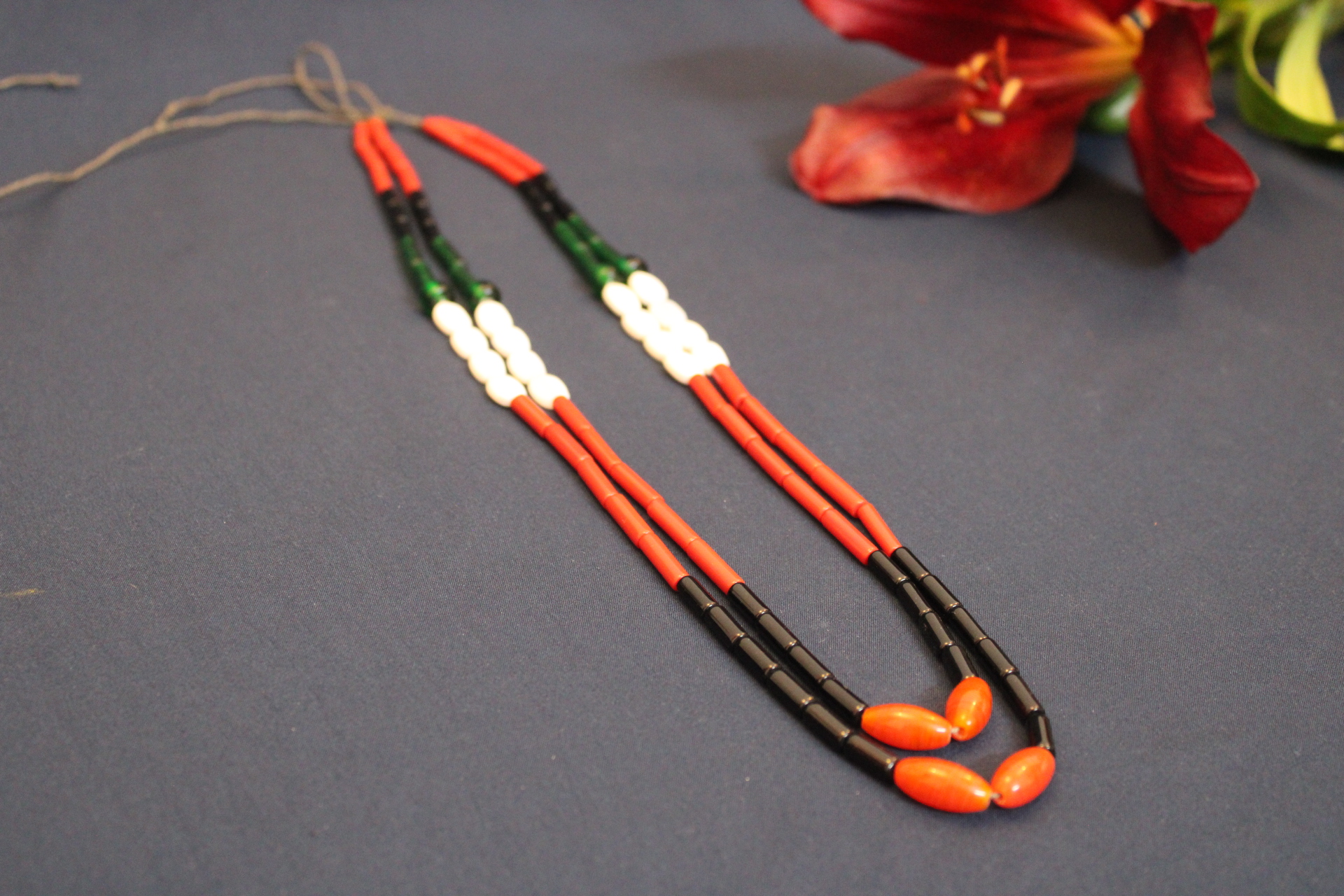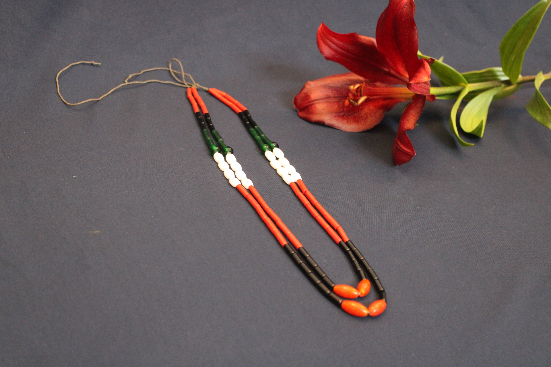 Be the first to review “Fashionable kongsang, small orangish chamthei, black & orange tubes combined with egg-shape white beads, 2 lines handmade kongsang”