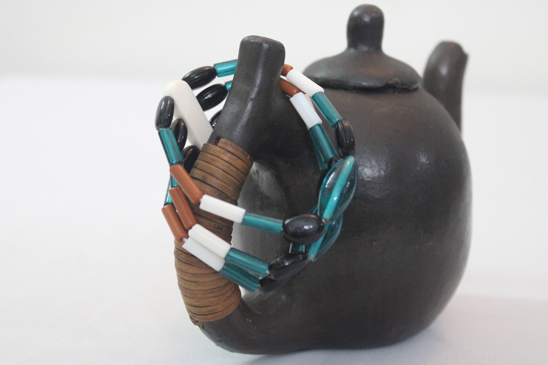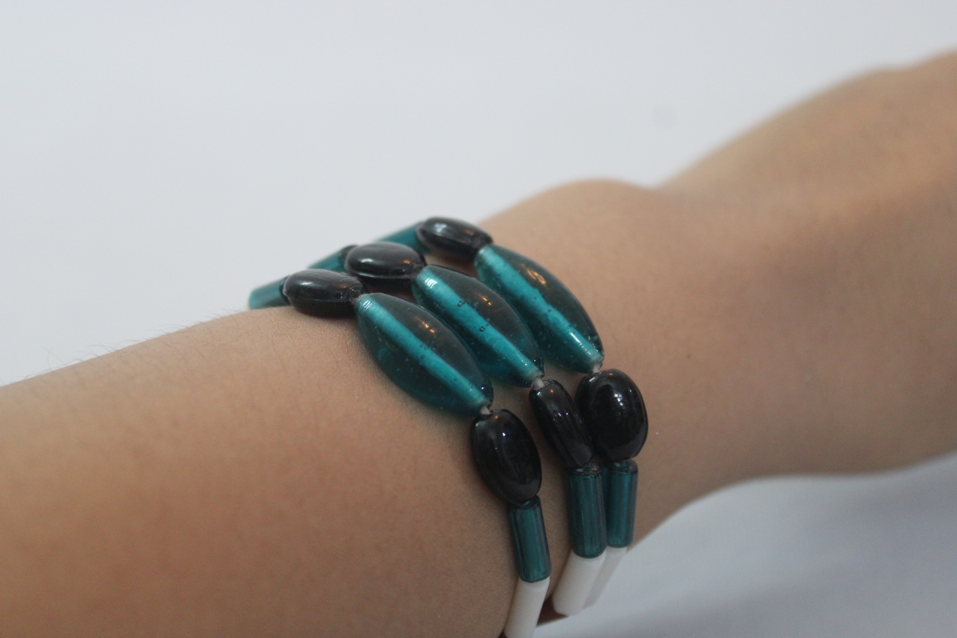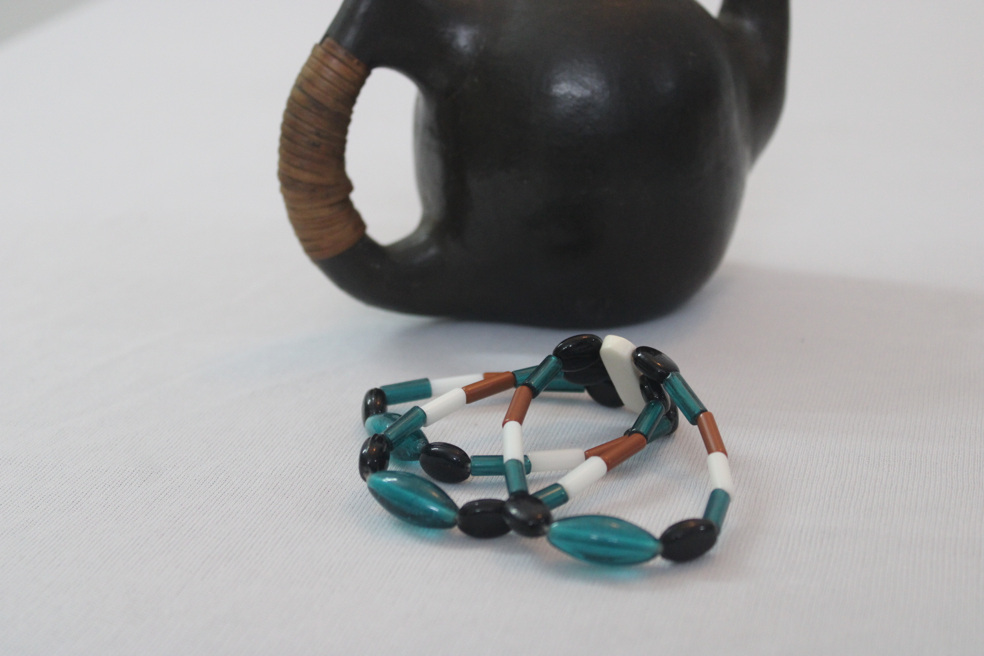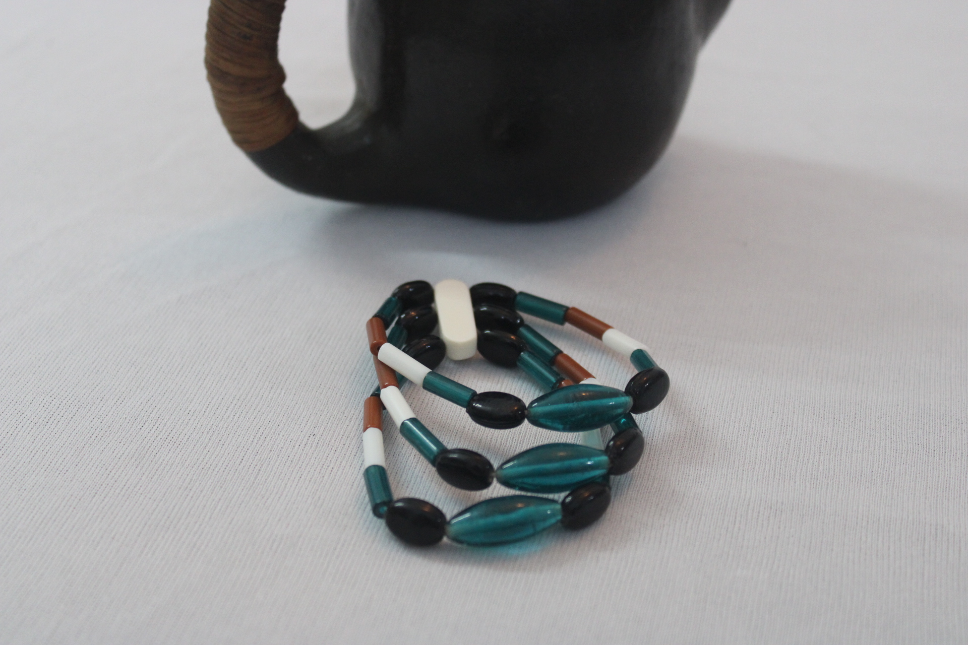 Glossy three line traditional bracelet with green chamthei, black oval beads, green, orange and white pipes