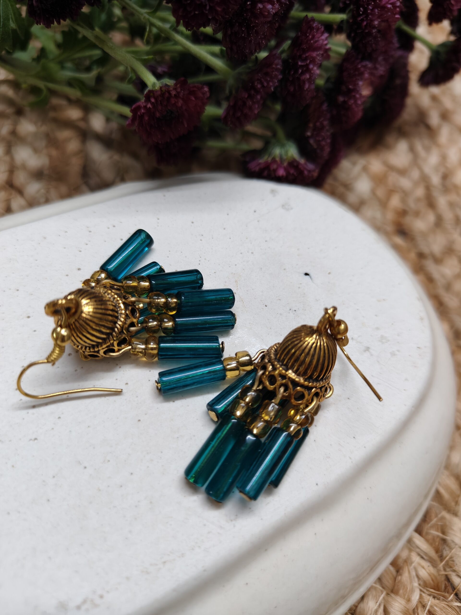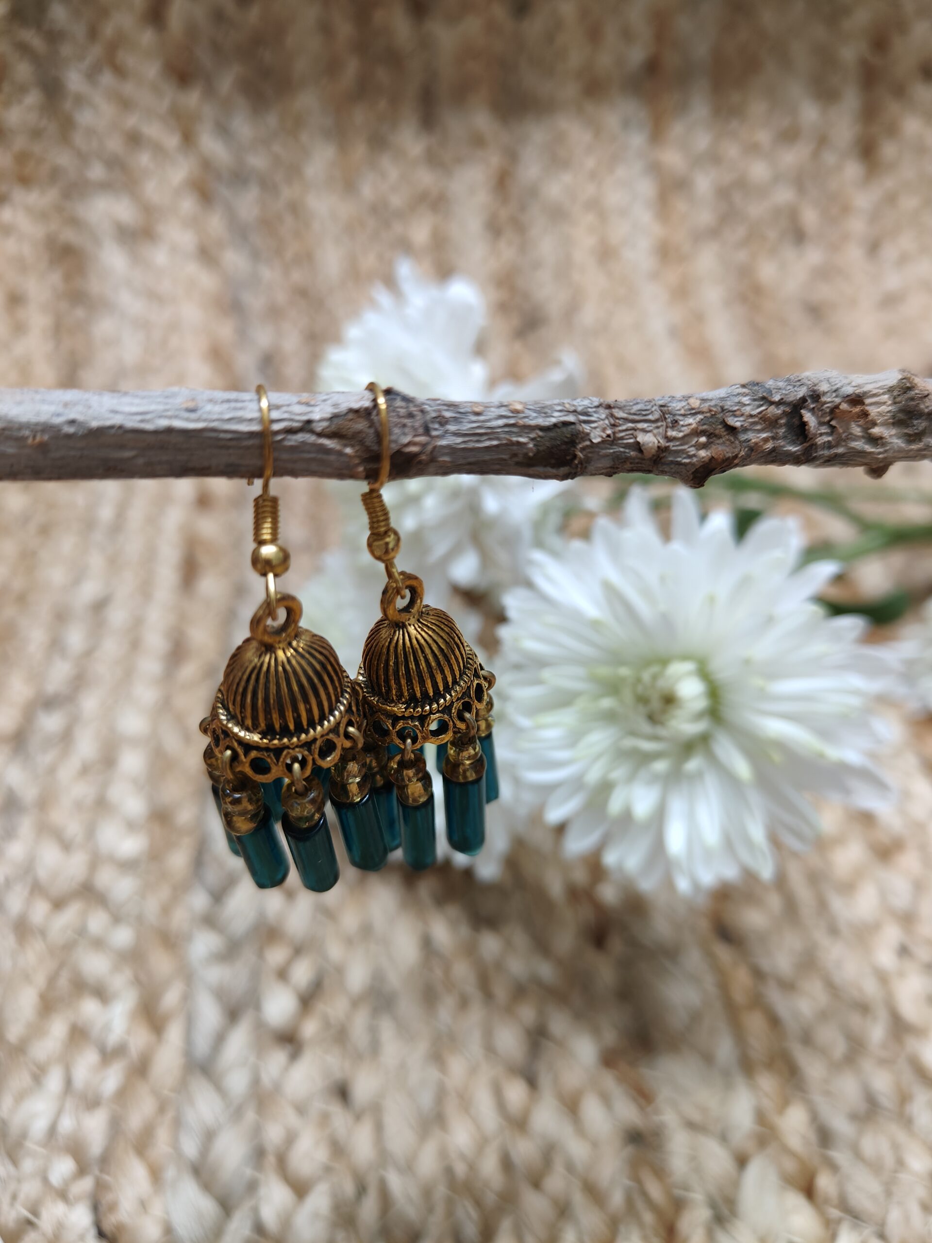 Golden Jhumka earring mixed with traditional style, seven short strings with green tubes with small yellow beads