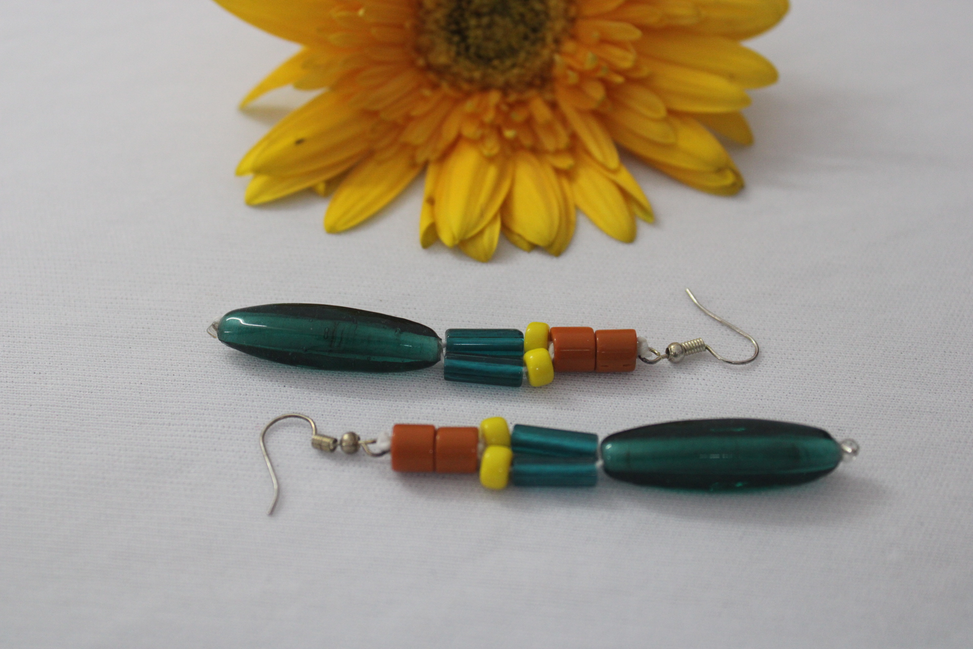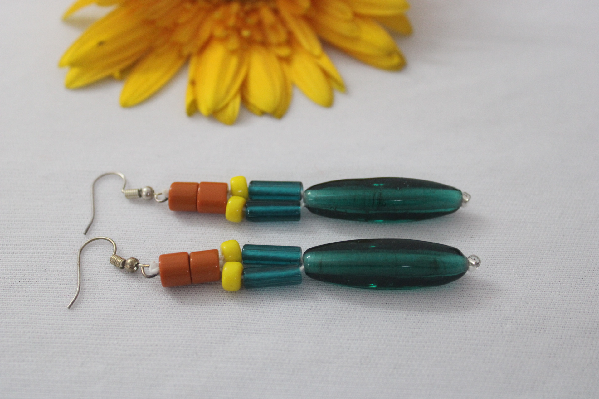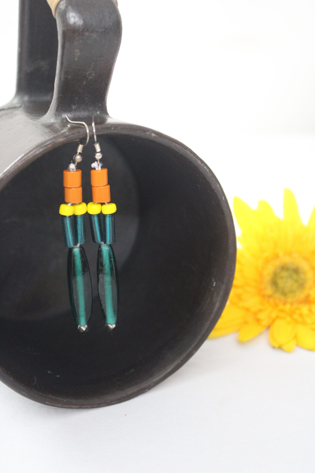 Modern earring with big orange beads, two green pipes and long green chamthei | combined one string