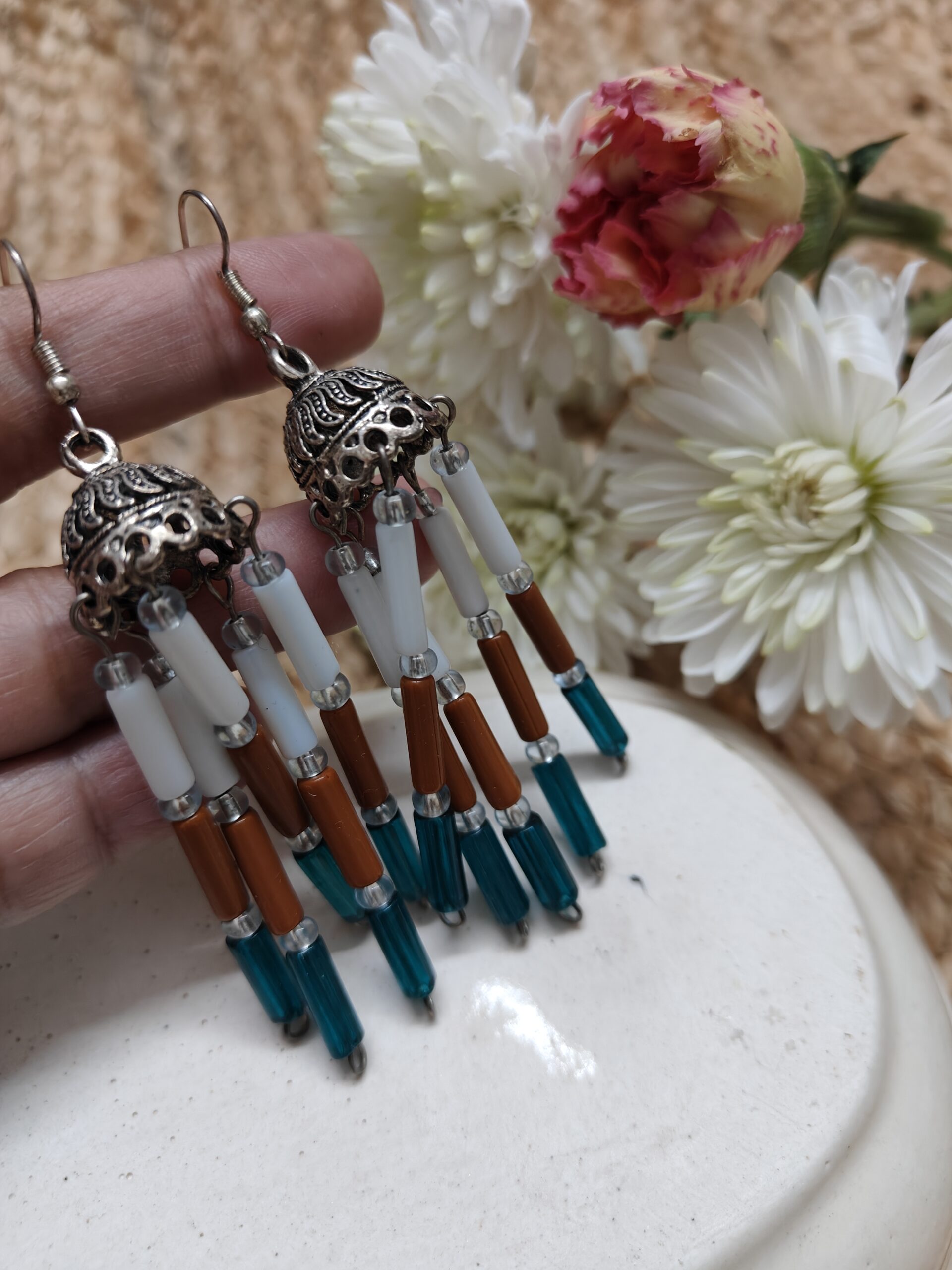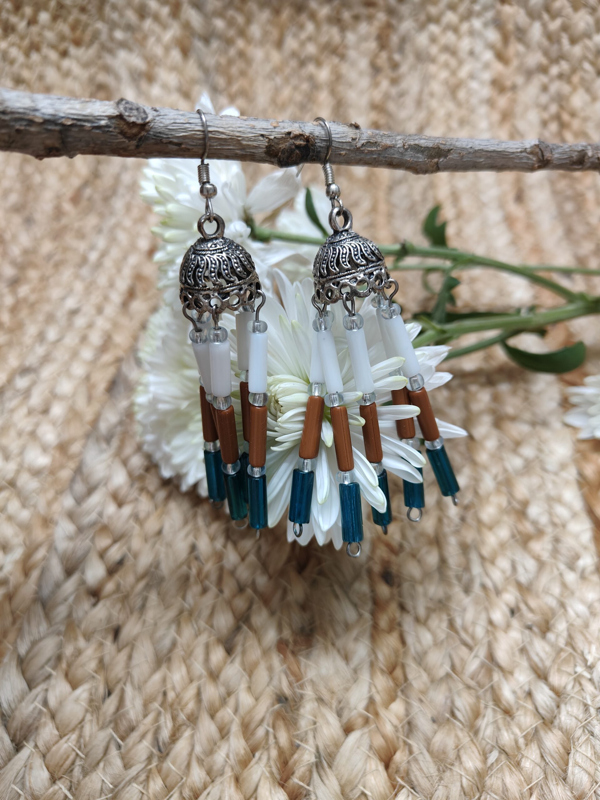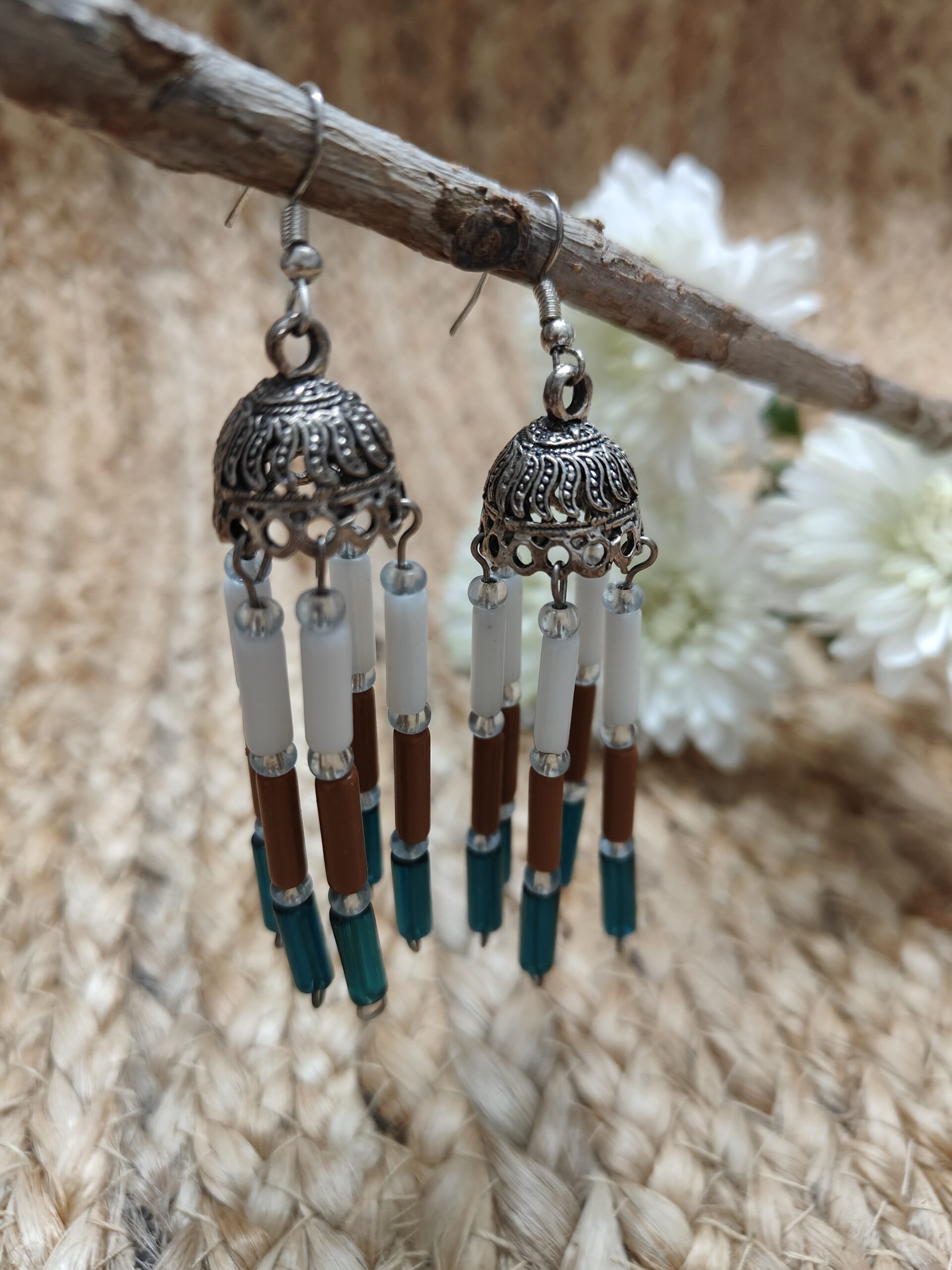Silver Jhumka earring mixed with traditional style, five strings with white, brown and green tubes