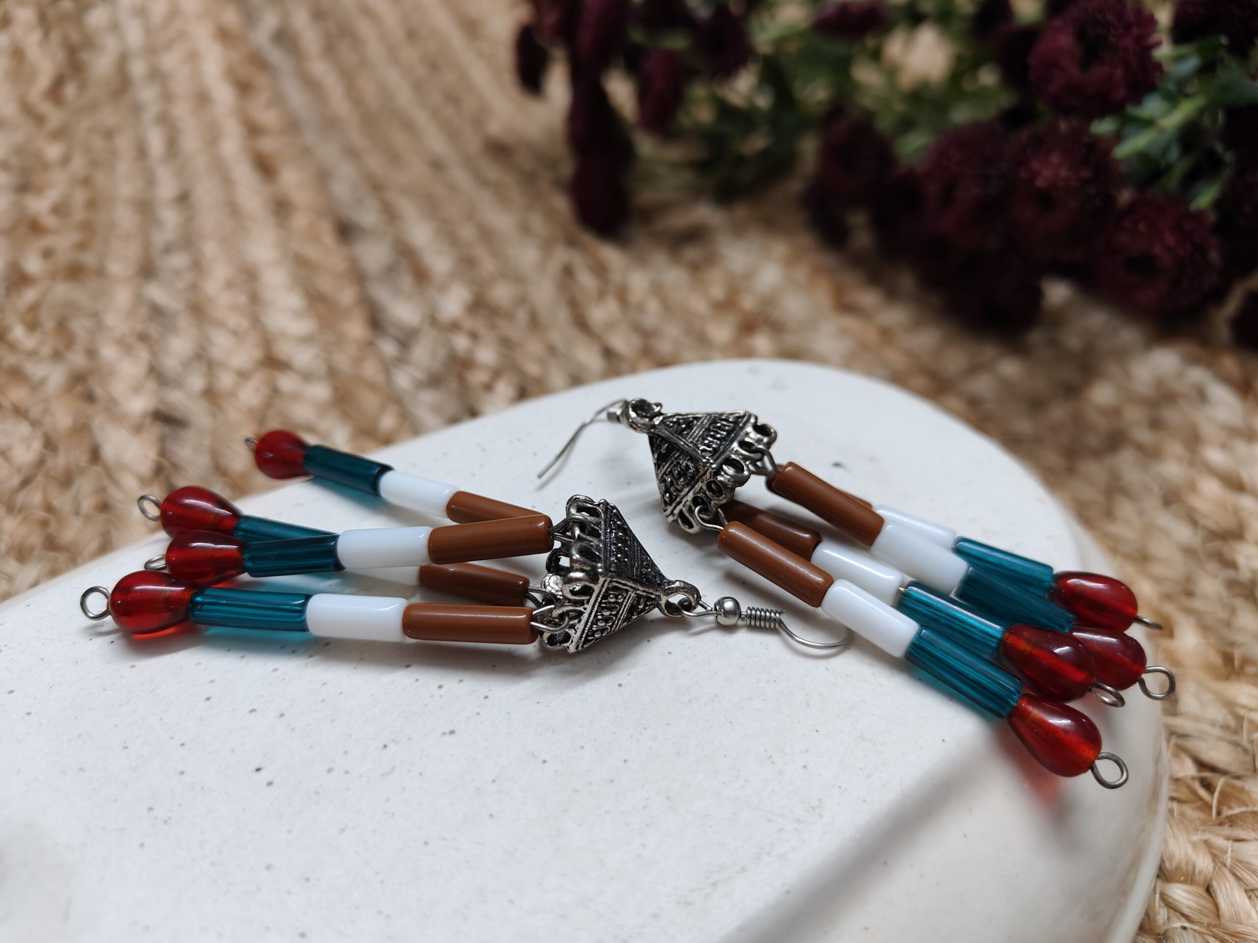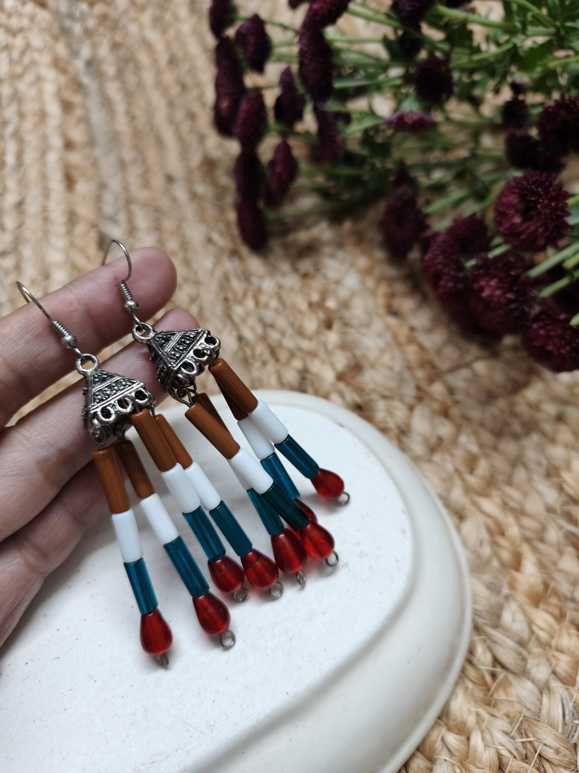 Silver Jhumka earring mixed with traditional style, four strings with brown, white and green tubes and red chamthei